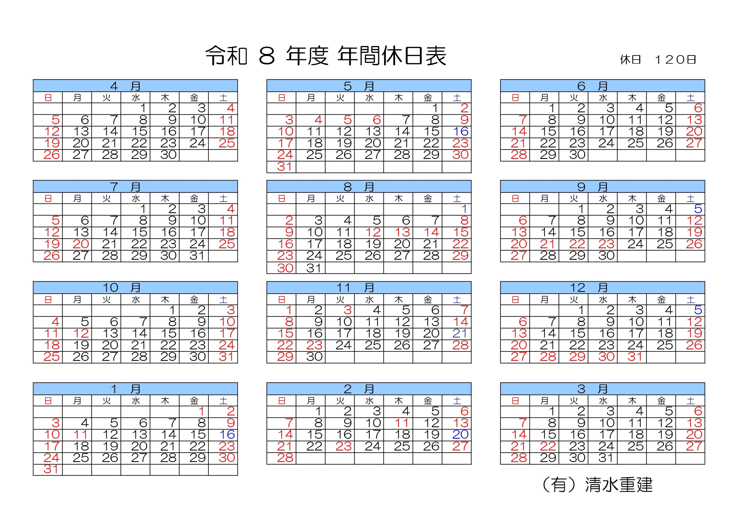 営業日のお知らせ(令和8年度)